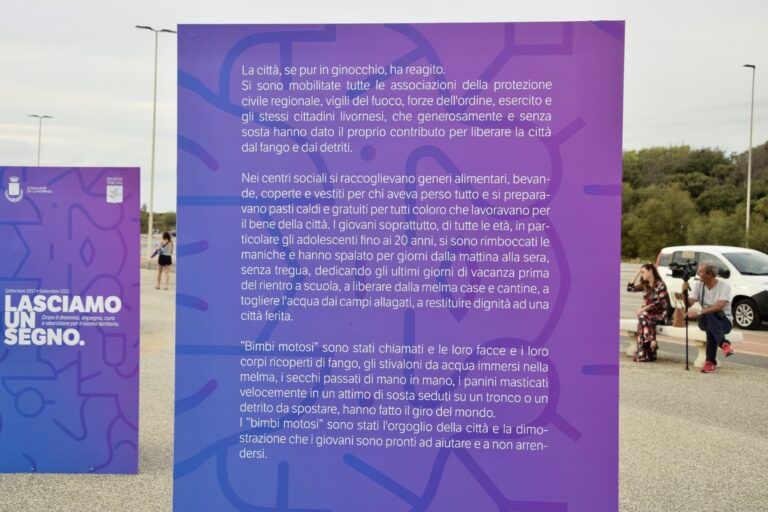 Dodici totem, tre facce per ognuno, negli spazi della Rotonda d’Ardenza lato “Gabbiano”. Su alcuni di questi una serie di fotografie, su altri ricordi, dettagli e particolarità che mettono in mostra tutto ciò che ruota intorno ad uno degli eventi più drammatici della città: l’alluvione di settembre 2017. Un lavoro fortemente voluto dall’amministrazione comunale e realizzato grazie al contributo del Genio Civile, della Regione Toscana e delle fotografie di Laura Lezza. “Abbiamo pensato che fosse opportuno strutturare un momento di riflessione e ricordo in modo particolare – spiega il sindaco Luca Salvetti – Perché cinque anni sono un passaggio da sottolineare. Il titolo della mostra è “Lasciamo un segno”, perché è proprio questo quello che abbiamo voluto fare, lasciare un segno di quello che è successo e di ciò che è avvenuto dopo. A distanza di neanche cinque anni, la Regione Toscana e il Genio Civile coadiuvati dall’amministrazione comunale sono riusciti a realizzare degli interventi incredibili”. Alla cerimonia di inaugurazione della mostra (visitabile fino al 15 settembre) sono presenti l’assessora regionale alla difesa del suolo e della Protezione Civile Monia Monni, l’ingegnere del Genio Civile Francesco Pistone, il consigliere regionale Francesco Gazzetti, la delegata del Consorzio di bonifica 5 Toscana Costa Barbara La Comba e la fotografa Lezza, che ha voluto sottolineare come “ricordare significa anche comprendere quanto accaduto in quelle drammatiche ore e riflettere su come l’uomo sia impotente di fronte alla forza della natura, verso cui l’unica arma che ha a disposizione è quella della prevenzione”.