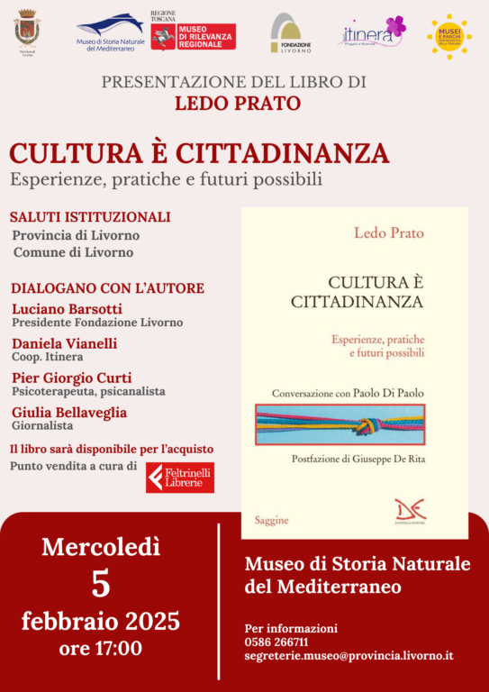 Mercoledì 5 febbraio, alle 17, il Museo di Storia Naturale del Mediterraneo di Livorno ospiterà la presentazione del nuovo libro di Ledo Prato, Cultura è cittadinanza. Esperienze, pratiche e futuri possibili. Sarà un’occasione speciale per approfondire i temi trattati nel volume e dialogare con l’autore. L’evento è a ingresso libero fino a esaurimento posti.