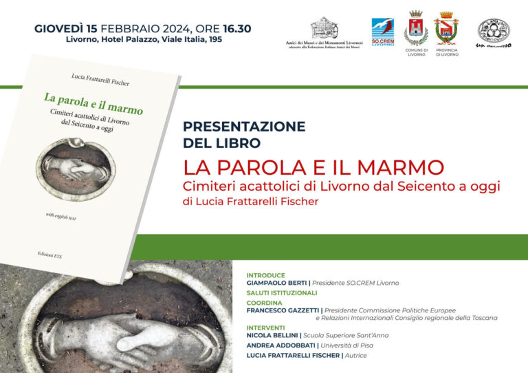 La So.crem Livorno, nel proseguio delle sue attività di valorizzazione e promozione del patrimonio storico artistico e culturale di Livorno, annuncia l’uscita del volume La parola e il Marmo. Cimiteri acattolici di Livorno dal Seicento ad oggi a cura della storica Lucia Frattarelli Fisher. Il libro sarà presentato giovedì 15 febbraio alle ore 16,30 al Grand Hotel Palazzo di Livorno. Interverranno Giampaolo Berti, presidente della So.Crem Livorno e Annamaria Tomassi presidente degli Amici dei Musei e dei Monumenti Livornesi, l’autrice Lucia Frattarelli Fisher, Nicola Bellini della Scuola Superiore Sant’Anna, Andrea Addobbati, dell’Università di Pisa e Francesco Gazzetti, nel ruolo di coordinatore.