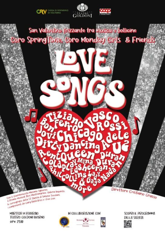 Serata fatta di buona musica e vino di qualità con i cori SpringTime e Monday Girls diretti dal maestro Cristiano Grasso. E' questo quanto offre il Teatro Goldoni per San Valentino con Love Songs. L’evento, che vedrà protagonisti il Coro SpringTime e Monday Girls & Friends, è realizzato con la Scuola Europea Sommelier Livorno, Movimento Turismo del Vino Toscana e Strada del Vino e dell’Olio Costa degli Etruschi (partner dell’iniziativa), Unicoop Tirreno e Cassa di Risparmi di Volterra (sponsor)
