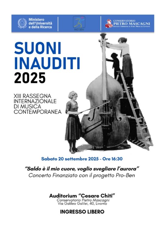 La rassegna internazionale di musica contemporanea Suoni Inauditi, organizzata dal Conservatorio Statale di Musica “Pietro Mascagni” di Livorno e curata dal M° Fabio De Sanctis De Benedictis, presenta sabato 20 settembre alle ore 16.30 presso l’Auditorium “Cesare Chiti” il concerto “Saldo è il mio cuore, voglio svegliare l’aurora”. Protagonisti saranno Manuela Galizia (voce) e Barrie Webb (trombone) con un programma che propone pagine di Giuliano, Colardo, Berio, Seither e Bussotti, insieme alla prima esecuzione assoluta di “Salmo” (2025) di Fabio De Sanctis De Benedictis, scritto per Manuela Galizia. L’appuntamento è legato alla masterclass “L’esecuzione musicale per la voce e per il trombone” e rientra nella tredicesima edizione di Suoni Inauditi, realizzata nell’ambito del progetto Pro-Ben, finanziato dal Ministero dell’Università e della Ricerca.