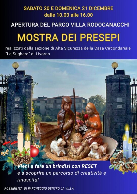 Sabato 20 e domenica 21 dicembre il parco di Villa Rodocanacchi a Monterotondo aprirà le sue porte al pubblico per ospitare la Mostra dei Presepi promossa da Reset e visitabile dalle ore 10 alle 16. L’esposizione raccoglie presepi realizzati dalla sezione di Alta Sicurezza della Casa Circondariale “Le Sughere”, frutto di un percorso di creatività e impegno che unisce tradizione e valore sociale. Durante le due giornate sarà possibile partecipare a un momento conviviale che racconta la rinascita attraverso l’arte e il lavoro manuale. È prevista la possibilità di parcheggio all’interno della villa.