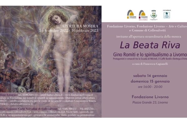 Fondazione Livorno comunica che sabato 14 e domenica 15 gennaio 2023 sarà possibile visitare le sezioni livornesi della mostra La Beata Riva. Gino Romiti e lo spiritualismo a Livorno. I locali della Fondazione in piazza Grande 23, resteranno aperti al pubblico con ingresso libero e gratuito dalle 16 alle 20.