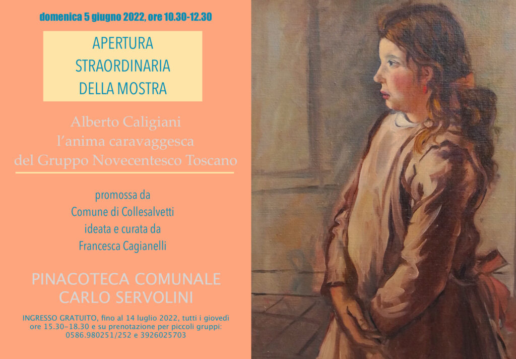 A seguito delle prenotazioni pervenute la Pinacoteca Comunale Carlo Servolini ha il piacere di annunciare la 2° Apertura Straordinaria in occasione della mostra “Alberto Caligiani: l’anima caravaggesca del Gruppo Novecentesco Toscano”, promossa dal Comune di Collesalvetti, ideata e curata da Francesca Cagianelli, in collaborazione con gli eredi dell’artista: Marco, Stefano e Paolo Moschi, Carla Pii e Lucia Caligiani (INGRESSO GRATUITO, fino al 14 luglio 2022, tutti i giovedì, ore 15.30-18.30 e su prenotazione per piccoli gruppi: 0586.980251/252 e 3926025703), in programma domenica 5 giugno 2022, ore 10.30-12.30.
