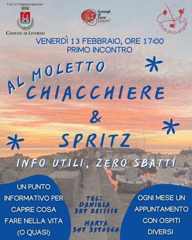 Si tratta dunque di un progetto che parte dal basso e che si articolerà come un percorso di incontri mensili, su aree tematiche quali per esempio l’orientamento scolastico e professionale, lavoro e diritti, educazione economica, benessere fisico e psicologico, ambiente e cittadinanza attiva, digitale e tecnologia, mobilità, tempo libero e cultura. Il primo incontro del 13 febbraio è dedicato alla presentazione della sperimentazione e alla conoscenza dei servizi e delle opportunità già presenti sul territorio, con un’attenzione particolare all’ascolto dei bisogni e delle proposte dei partecipanti, che contribuiranno a costruire il percorso dei prossimi appuntamenti. La scelta del Moletto di Antignano, luogo simbolico e fortemente identitario per la città, non è casuale: uno spazio sul mare che da sempre è luogo di aggregazione e ritrovo dei giovani non è solo una sede fisica, ma il contesto naturale, accogliente e informale, che già di per sé induce alla partecipazione e alla bellezza dello stare insieme come annuncia già il titolo dell’iniziativa: “Chiacchiere & Spritz – Info utili, zero sbatti”. La partecipazione è libera e aperta a tutti.