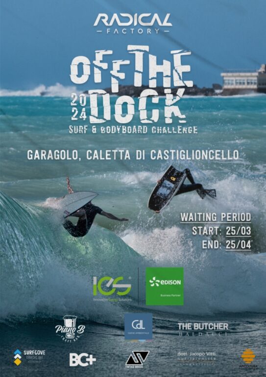 Sono ufficialmente aperte le iscrizioni per la seconda edizione della Off The Dock, gara di surf e bodyboard organizzata da Radical Factory con il patrocinio di Ies Edison, CdL igiene ambientale, Piano B e The Butcher. L’evento si svolgerà al famoso spot del Garagolo, a Caletta di Castiglioncello, con le prime condizioni meteo marine favorevoli tra il periodo che va dal 25 marzo al 25 aprile. Gli altri sponsor dell’evento sono Twins Bros, Bodyboard Center, Surf Cove, Jacopo Vitti nutrizionista e Apicoltura Val di Boboli.