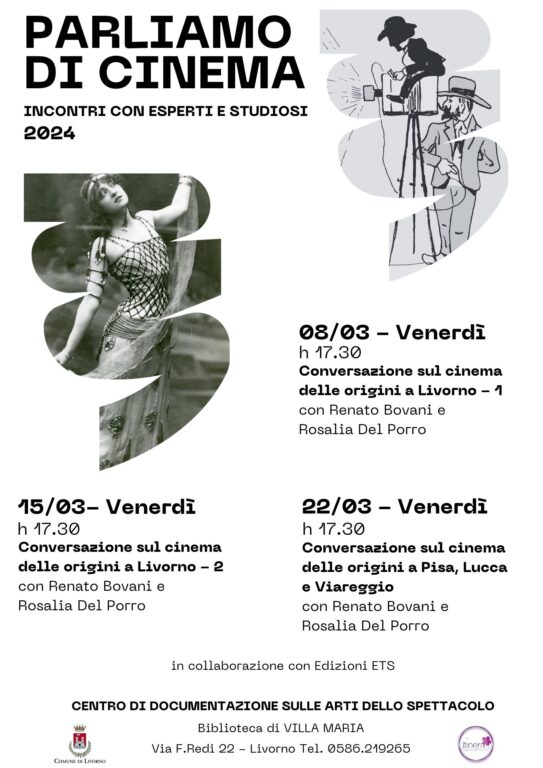 Parliamo di cinema alla Biblioteca Labronica sede di Villa Maria, Centro di documentazione sulle arti dello spettacolo è una iniziativa promossa dal Comune di Livorno e organizzata da Cooperativa Itinera che prevede 3 incontri, il venerdì pomeriggio alle 17.30 dedicati al cinema delle origini a Livorno e in Toscana. Si comincia venerdì 8 marzo e si prosegue venerdì 15 e 22 marzo. Attraverso una conversazione con gli autori Renato Bovani e Rosalia Del Porro che hanno dedicato molti anni agli studi e alle ricerche archivistiche saranno svelati aspetti inediti della nascita del cinema e dell’arrivo del cinema a Livorno e in Toscana. Renato Bovani e Rosalia Del Porro si sono laureati presso la Facoltà di lettere dell’Università di Pisa con una tesi in Storia e Critica del cinema incentrata sul cinema delle origini a Livorno. Dal 1980 si sono dedicati alla ricerca di materiali documentari e iconografici per la ricostruzione della memoria storica del cinematografo (negli anni tra il 1895 e il 1915) nello specifico territorio dell’area occidentale della Toscana. I loro studi sono confluiti in numerosi saggi e articoli pubblicati in quotidiani locali e nazionali, in riviste specializzate e in pubblicazioni monografiche, in particolare: “La macchina delle meraviglie – Gli albori del cinema a Livorno (1895-1915)”e “Quando il cinema arriva a Viareggio storia, memoria e cronache (1896-1915)”, entrambi Felici Editore, e “La fotografia animata a Lucca Memorie e cronache del cinema delle origini (1897-1915) e “Il cinema a Pisa dalle origini alla Grande Guerra 1897-1915” Edizioni ETS.