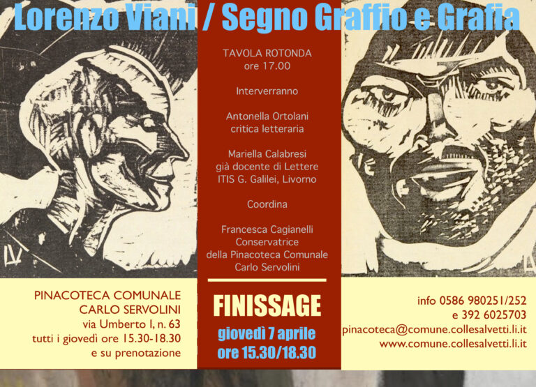 Sull’onda di un’istanza didattica lievitata in termini esponenziali nel corso del Calendario Culturale 2022, “Viandanti d’Europa. Miti apuani nella Toscana di Pascoli e d’Annunzio”, promosso dal Comune di Collesalvetti, ideato e curato da Francesca Cagianelli, la Pinacoteca colligiana ha optato per la formula del Finissage con Tavola Rotonda, dal titolo Lorenzo Viani/Segno Graffio e Grafia, con l’obiettivo di dilatare ulteriormente il cannocchiale storiografico sulla mission letteraria di Lorenzo Viani.