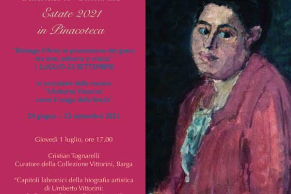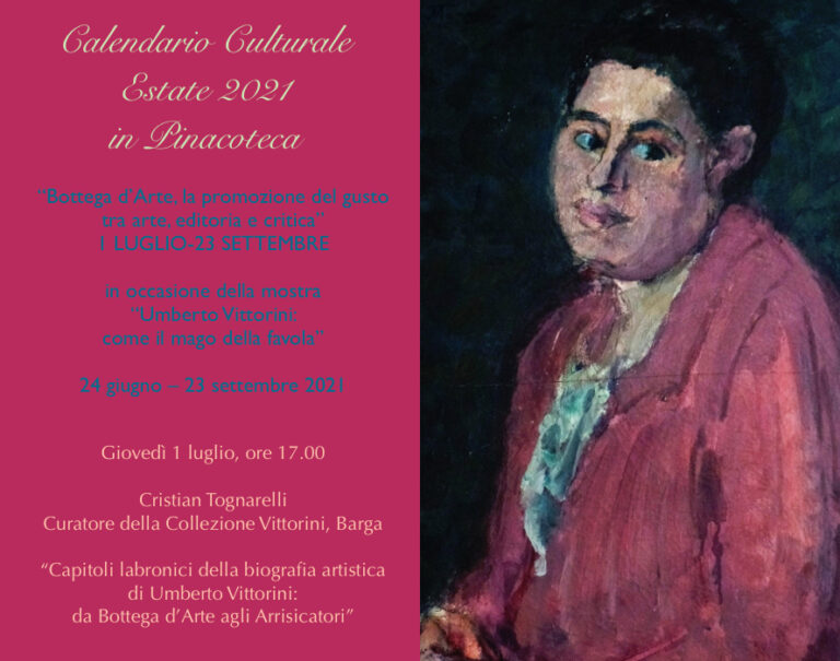 Al via giovedì 1 luglio 2021 alle ore 17.00, alla Pinacoteca Comunale Carlo Servolini, la prima puntata del Calendario Culturale Estate 2021 in Pinacoteca, “Bottega d’Arte, la promozione del gusto tra arte, editoria e critica” (1 luglio -23 settembre 2021), varato in occasione della mostra “Umberto Vittorini: come il mago della favola” (24 giugno – 23 settembre 2021, tutti i giovedì, ore 15.30-18.30), promossa dal Comune di Collesalvetti, ideata e curata da Francesca Cagianelli con Cristian Tognarelli (curatore Collezione Vittorini, Barga), in collaborazione con Fondazione Ricci onlus, Barga, con la partecipazione di Nicola Micieli.