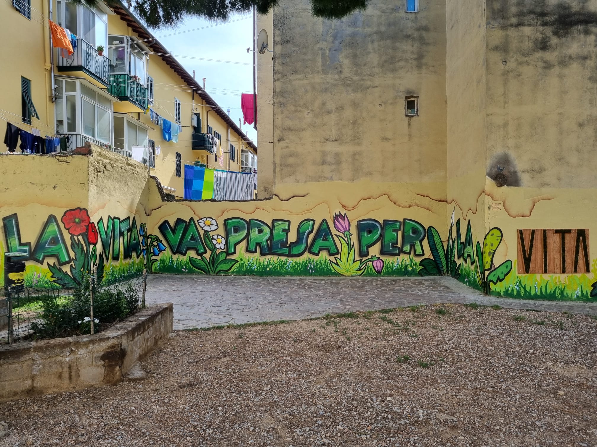 Realizzata da Ninjart, l'opera "La vita va presa per la vita" è stata completata dagli abitanti attraverso il posizionamento del muschio nelle lettere finali VITA e dalle signore del quartiere con la realizzazione delle aiuole. Dopo l'inaugurazione, un brindisi-aperitivo e un po' di musica con il dj set di Dyami
