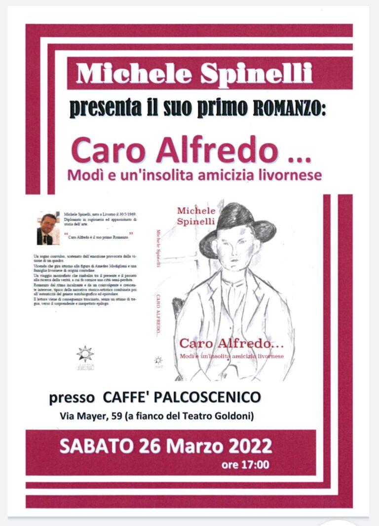 Sabato 26 marzo al caffè Palcoscenico di Livorno è stato presentato il primo romanzo di Michele Spinelli “Caro Alfredo… Modì e una insolita amicizia livornese” edito da CTL Livorno. L’autore, protagonista indiretto del racconto, indaga sull’amicizia inconsueta tra Amedeo Modigliani e un coetaneo di periferia. La Livorno di fine 800/primi 900 fa da scenario. L’evento, presentato da Riccardo Tola e Sabrina Tola, è stato piacevole e il dibattito seguito con particolare interesse dai numerosi partecipanti presenti.