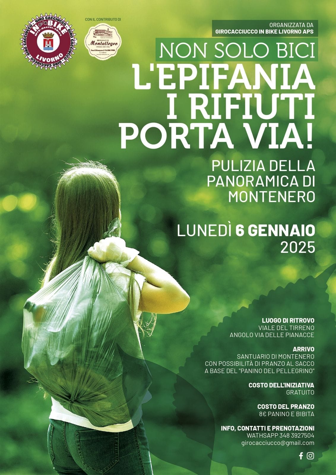L’Epifania i rifiuti porta via. L’iniziativa prevede la pulizia della Panoramica (via del Tirreno) facendo una passeggiata suddivisi in più gruppi per poi accorpare tutti i sacchi raccolti in un unico punto su indicazioni di Aamps. Partecipazione gratuita. Dopodiché al ristorante Montallegro ci sarà la possibilità di acquistare un panino e una bibita. Il “famoso” panino del Pellegrino che veniva preparato per i pellegrini che passavano dal Santuario. Sacchi e guanti saranno offerti dal ristorante Porto di Mare. Adesioni entro sabato 4 gennaio tramite whatsapp al 348 3927504 o mail [email protected].