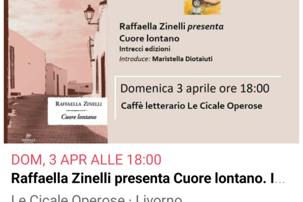 Domenica 3 aprile alle 18 la scrittrice Raffaella Zinelli presenterà il suo libro Cuore Lontano (Intrecci Edizioni) al Caffè letterario Le Cicale Operose. Introduce la serata Maristella Diotaiuti.