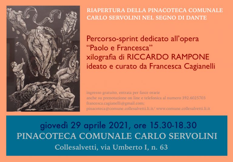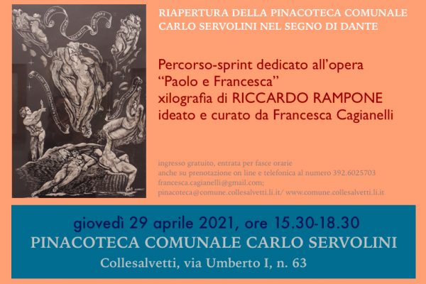 Fortemente voluta anche la scelta dell’evento inaugurale della Primavera culturale 2021, se è vero che la riapertura della sede museale si annuncia programmaticamente nel segno di Dante e coinciderà con un atto di promozione del patrimonio artistico museale, per lunghi mesi inaccessibile al pubblico, ovvero con un percorso-sprint ideato e curato dalla Conservatrice della Pinacoteca, Francesca Cagianelli (a partire dalle 15.30, ultimo turno ore 18.00), dedicato all’opera “Paolo e Francesca”, xilografia di Riccardo Rampone, presente nelle collezioni del Comune di Collesalvetti (donazione dell’artista).