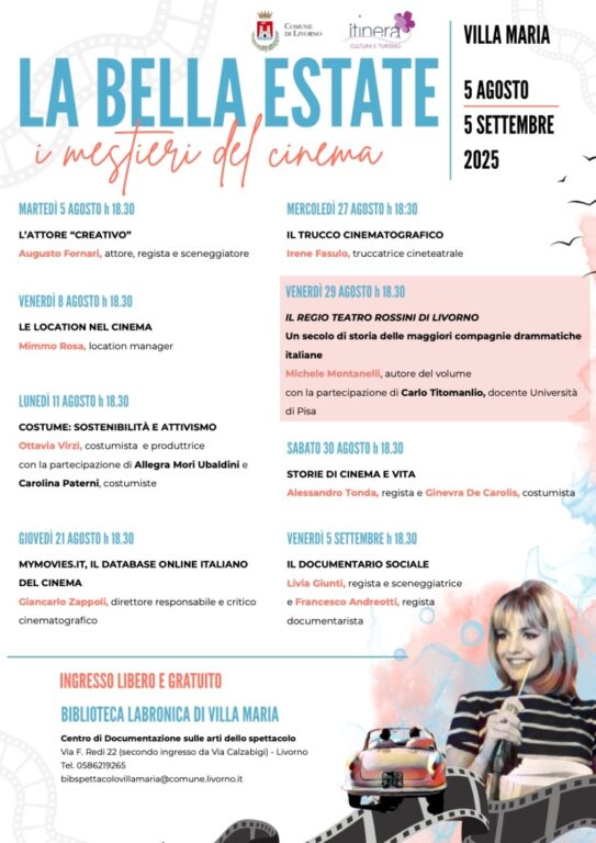 critici cinematografici sono invitati a condividere la propria esperienza con il pubblico e raccontare le professioni e le azioni che stanno dietro la macchina da presa. Gli incontri si terranno alla Biblioteca Labronica Villa Maria – Centro di Documentazione sulle Arti dello Spettacolo (via Redi 22), a partire da martedì 5 agosto alle ore 18.30 con ingresso gratuito e senza prenotazione.