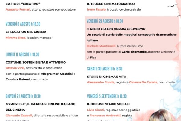 Si comincia il 5 agosto con Augusto Fornari, attore di cinema e TV, regista, sceneggiatore e formatore, che presenterà il suo metodo dell’attore “creativo”. A seguire, l’8 agosto, sarà la volta delle location cinematografiche con Mimmo Rosa, che da oltre 15 anni cura le produzioni cinematografiche e televisive, e gli spot commerciali di importanti marchi, che passano da Livorno e dintorni. Per poi affrontare l’11 agosto, con Ottavia Virzì, il tema del costume di scena e della sua sostenibilità, in un mondo in cui siamo chiamati a fare i conti con la crisi climatica. All’incontro prenderanno parte anche le colleghe Allegra Mori Ubaldini e Carolina Paterni. Dopo l’incontro, alle 21.30, all’Arena Fabbricotti (viale della Libertà, 30), avrà luogo la proiezione del documentario “Come se non ci fosse un domani” di cui Ottavia Virzì è produttrice, regia di Riccardo Cremona e Matteo Keffer che racconta gli attivisti contro i cambiamenti climatici di Ultima Generazione. Il 21 agosto sarà protagonista il critico cinematografico Giancarlo Zappoli, direttore di MyMovies.it, il motore di ricerca italiano sul cinema, punto di riferimento per appassionati e addetti ai lavori, che è anche scrittore e direttore artistico di “Castellinaria” il festival del cinema giovane di Giubiasco, Svizzera. L’ultima settimana di agosto sarà particolarmente intensa, con ben tre appuntamenti: