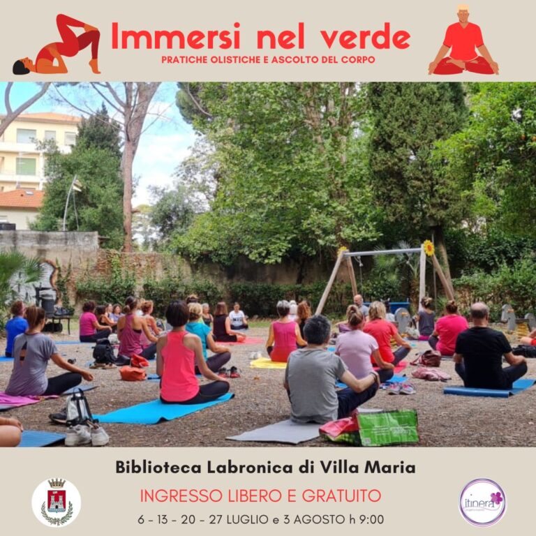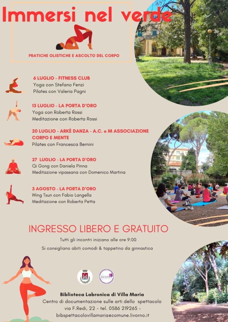 Anche quest’anno la Biblioteca Labronica sede di Villa Maria, Centro di documentazione sulle arti dello spettacolo, promuove gli incontri di pratiche olistiche all’aperto per ritrovare la connessione fra corpo e mente, nella calma e nel silenzio del parco: come scriveva Herman Hesse infatti, “gli alberi sono santuari. Chi sa parlare con loro, chi li sa ascoltare, conosce la verità. Essi non predicano dottrine e precetti, predicano, incuranti del singolo, la legge primigenia della vita”. Guidati da professionisti del settore, sotto l’ombra dei cedri del Libano o nell’area dove un tempo sorgevano i campi da tennis della villa, sarà possibile meditare e praticare insieme esercizi base di yoga, pilates e qi gong. Al quinto anno consecutivo gli incontri del sabato mattina, che avranno luogo dal 6 luglio al 3 agosto, sono a ingresso libero e aperti a tutti. Per partecipare si consigliano abiti comodi e tappetino da ginnastica.