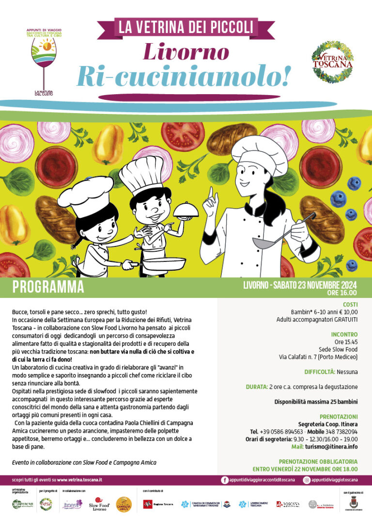 In occasione della Settimana Europea per la Riduzione dei Rifiuti, Vetrina Toscana organizza un evento promosso da Confesercenti Provinciale Livorno in collaborazione con Slow Food Livorno e la Bottega di Campagna Amica. Un evento dedicato ai piccoli consumatori di oggi con un percorso di consapevolezza alimentare fatto di qualità e stagionalità dei prodotti e di recupero della più vecchia tradizione toscana: non buttare via nulla di ciò che si coltiva e di cui la terra ci fa dono! Un laboratorio di cucina creativa in grado di rielaborare gli “avanzi” in modo semplice e saporito insegnando a piccoli chef come riciclare il cibo senza rinunciare alla bontà. Ospitati nella prestigiosa sede di slowfood i piccoli saranno accompagnati in questo interessante percorso grazie ad esperte conoscitrici del mondo della sana e attenta gastronomia partendo dagli ortaggi più comuni presenti in ogni casa. Con la sapiente guida della cuoca contadina Paola Chiellini di Campagna Amica cucineremo un pesto arancione, impasteremo delle polpette appetitose, berremo ortaggi e… concluderemo in bellezza con un dolce a base di pane.