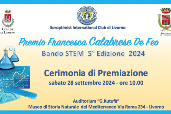 Sabato 28 settembre alle 10, nell’Auditorium “Giorgio Kutufà” del Museo di Storia Naturale via Roma 234, alla presenza della vicesindaca Libera Camici, del vicepresidente della Provincia Pietro Caruso e della professoressa Cristina Grieco presidente INDIRE avrà luogo la cerimonia di premiazione del premio Francesca Calabrese De Feo Bando STEM 5 edizione 2024. In questa occasione il Soroptimist Club Livorno premia delle studentesse che si sono distinte durante tutto il loro percorso scolastico raggiungendo un’eccellente preparazione generale con particolare riguardo alle discipline scientifiche e tecnologiche.