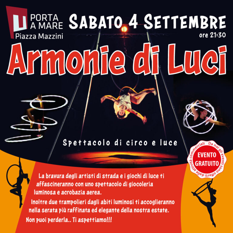 Il Consorzio Porta a Mare è lieto di ospitare nuovamente lo spettacolo degli artisti di strada. Tornano per la gioia del pubblico Federica e Massimo del Duo Ariadna che sabato 4 settembre dalle 21:30 si esibiranno nelle loro acrobazie circensi. Il colore bianco degli abiti dei due artisti insieme alle luci soffuse ed alla penombra creeranno la giusta atmosfera per uno degli spettacoli più raffinati ed eleganti della nostra estate. La bravura di Federica e Massimo, insieme ai loro incantevoli giochi di luce, ti coinvolgeranno in un grande spettacolo di giocoleria luminosa e acrobazia aerea, accompagnati da due trampolieri dagli affascinanti abiti luminosi che faranno da cornice alle splendide acrobazie. Dopo lo spettacolo di luci il Duo Ariadna presenterà anche alcune spettacolari performance di fuoco ipnotico. Vieni a trascorrere a Porta a Mare un’altra serata di questa splendida estate.