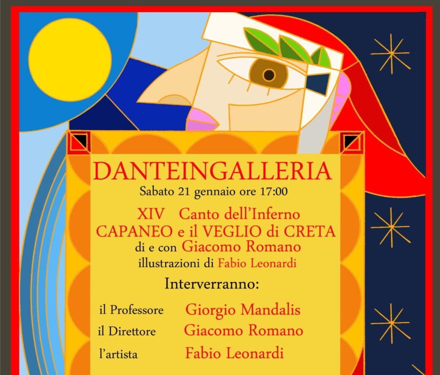 In questo primo incontro del 2023, Giacomo Romano leggerà il Canto XIV dell’Inferno – Capaneo e il Veglio di Creta-; partecipano al pomeriggio l’artista Fabio Leonardi che ha ideato per questo Canto quattro opere a stampa digitale ed il professore Giorgio Mandalis che ci parlerà della Commedia.