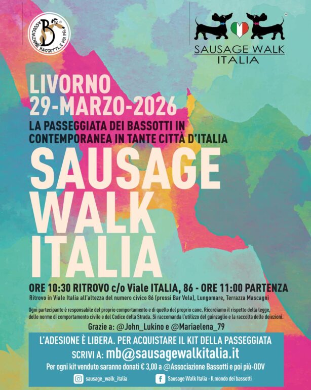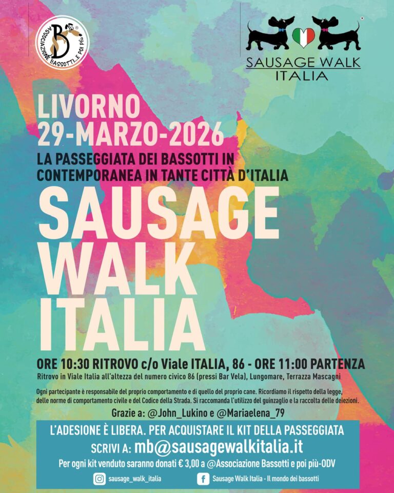 Domenica 29 marzo Livorno ospiterà per la prima volta la Sausage Walk Italia, la passeggiata solidale dedicata ai bassotti e ai loro accompagnatori in programma in contemporanea in oltre 35 città italiane. L’iniziativa, arrivata alla ottava edizione, è diventata negli anni un appuntamento nazionale molto partecipato da famiglie e appassionati di animali. Una mattinata all’aria aperta che unisce socialità, amore per i cani e attenzione alla solidarietà. Il ritrovo dei partecipanti è fissato alle 10.30 sul lungomare, nei prati antistanti il monumento al Marinaio, da dove partirà una passeggiata collettiva sino alla Terrazza Mascagni. Il percorso sarà semplice e accessibile, pensato per consentire a tutti di partecipare insieme ai propri nanetti, ma saranno ben graditi anche cani di altre razze. La Sausage Walk sostiene “Bassotti… e poi più Odv”, associazione impegnata nel recupero e nella tutela dei bassotti in difficoltà. Parte del ricavato derivante dalla vendita, per chi volesse, del Kit Passeggiata, prenotabile in anticipo e spedito ai partecipanti, sarà destinata alle attività di assistenza e cura dei cani seguiti dall’associazione. La manifestazione, che negli anni ha coinvolto centinaia di partecipanti in tutta Italia, punta a promuovere momenti di incontro tra proprietari di cani, appassionati e cittadini, coniugando una passeggiata in compagnia con una finalità benefica. Per richieste di informazioni basta scrivere a [email protected]. Partecipazione gratuita.