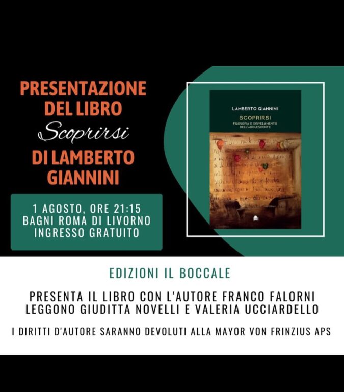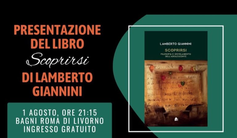 Martedì 1 agosto, ore 21.15, ai Bagni Roma di Livorno, viale di Antignano, 76, sarà presentato il libro di Lamberto Giannini, “Scoprirsi – Filosofia e svelamento dell’adolescenza” (Erasmo Libri – Edizioni Del Boccale, 2023). Con l’autore sarà presente Franco Falorni. Alcuni brani del libro saranno letti da Giuditta Novelli, e Valeria Ucciardelldo.