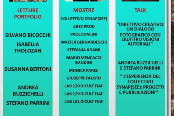 Il pomeriggio, a partire dalle 15.30 circa, si terrà con un talk dal titolo “Obiettivo Creativo: Un Dialogo Fotografico con Quattro visioni autoriali” che vedrà coinvolti 4 ospiti in mostra: Stefania Adami, Arez Prod, Walter Bernardeschi, Paolo Pacini; a seguire Andrea Buzzichelli e Stefano Parrini, componenti del Collettivo Synap(see) presenteranno i progetti portati avanti in questi anni.