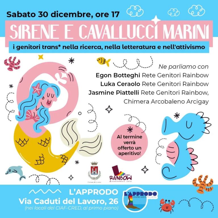 Sabato 30 dicembre al Centro Ascolto LGBTQ+ si svolgerà un’importante iniziativa sul tema della transgenitorialità intitolata “Sirene e cavallucci: i genitori trans* nella ricerca, nella letteratura e nell’attivismo”. I genitori trans* e non binari esistono e li racconteremo attraverso la testimonianza di tre genitori attivistɜ trans* che illustreranno cosa possiamo trovare in lingua italiana sull’argomento: nella ricerca scientifica, nella ricerca attivista e nella letteratura.