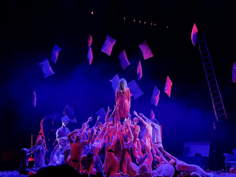 Cuscini che, come nuvole sospese, pendono dall’alto. D’improvviso, sulla sinistra, un dinosauro che ne morde uno. Poi, tanti oggetti da casa, un materasso, delle sedie, un attaccapanni e una foto di Pasolini. Una scenografia decisamente surreale accoglie una platea stracolma, arrivata al Teatro Goldoni per “Sonnambuli”, il nuovo spettacolo della Compagnia Mayor von Frinzius. Appena si arriva quello che si nota è una piazza pienissima di persone, di tutte le età e di tanti giovani. Dentro, c’è qualche minuto di attesa e poi dal sipario spunta lui, il regista e l’”uomo della Compagnia”, Lamberto Giannini. Al suo fianco, ad accompagnarlo nella nuova avventura ci sono il sindaco Luca Salvetti, l’aiuto regista Marianna Sgherri, il responsabile Oami Piergiorgio Curti, il direttore artistico del Teatro Goldoni Emanuele Gamba e il direttore della Banca di credito cooperativo di Castagneto Carducci, Fabrizio Mannari. Luca, un attore della compagnia, invita in modo scherzoso (neanche troppo) i presenti a silenziare i telefoni, ed ecco il via. Più di due ore in un’immersione onirica ma reale, ironica ma riflessiva, del gruppo ma anche del singolo. “Non è mai abbastanza. Il vivere, il respirare, il sognare non sono mai abbastanza. I tuoi occhi non sono mai abbastanza. Il dolore non è mai abbastanza. Poi giunge, inizialmente timido e poi sempre più pungente, il languorino carico di vuoto, privo di significati. Vorresti scappare, vorresti non sentire, è sempre troppo e non è mai abbastanza poco. Urli, ti agiti e torni a respirare, sognare, vivere, ma ormai l’amaro tarlo ti accompagna e vorresti riassaporare il non è mai abbastanza figlio di un’epoca antica che non può tornare. E ti rendi conto che quell’età non è mai abbastanza” recita uno dei testi. Una prima teatrale, di nuovo al Goldoni dopo due anni di attesa, in cui c’è posto per pensieri concreti e umoristici riservati ai temi della violenza e della disabilità, ma anche per momenti leggeri e divertenti dedicati alle discussioni in famiglia o al ricordo di notissimi gruppi musicali del passato (Spice Girls e Backstreet Boys). Per l’intera durata dell’esibizione gli attori si fondono con il pubblico. Scendono dal palco, lo coinvolgono, lo “disturbano”. “Ir budella di su ma a chi butta la roba nei Fossi” recita un cartellone. Non manca infatti il riferimento alla città che da tanti anni (più di 25) incarna la forma dell’amore per i Mayor. Uno strabiliante gioco di luci in cui, per tante volte, il rosso domina la scena: palloncini, coriandoli e il vestito di una delle attrici. Verso la conclusione la disabilità è annientata. Una carrozzina smontata penzola e per i registi (Silvia Angiolini e Rachele Casali oltre a Giannini e Sgherri) è il tempo dei saluti e dei ringraziamenti. Quando tutto sembra finito, il momento più bello. Il pubblico, tutto, si alza, applaude e balla insieme agli attori. Degna conclusione di una serata di magica follia.