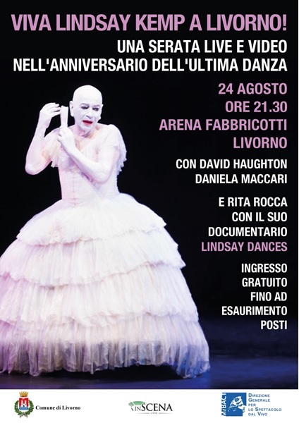 Il contenuto centrale dell’evento sarà la proiezione del bellissimo film di RAI 5, “Lindsay Dances – La vita e il teatro secondo Lindsay Kemp”, con la regia di Rita Rocca. Altri momenti live renderanno più viva e variata la serata: le musiche più amate da Lindsay suoneranno mentre il pubblico arriva, ci sarà una breve presentazione celebrativa con Haughton, Maccari e Rocca, alcuni contributi video dall’archivio personale di Kemp, una performance di Daniela Maccari – prima danzatrice e coreografa nell’ultima decade di Lindsay, e l’unica persona alla quale lui ha voluto trasmettere, chiedendole di danzarli senza di lui, alcuni dei suoi più celebri assoli… uno dei quali Daniela ci offrirà qui – come solo lei sa fare: un medium che trasmette l’essenza di Lindsay Kemp al suo pubblico. Come farà poi il film divertente e commovente “Lindsay Dances”.