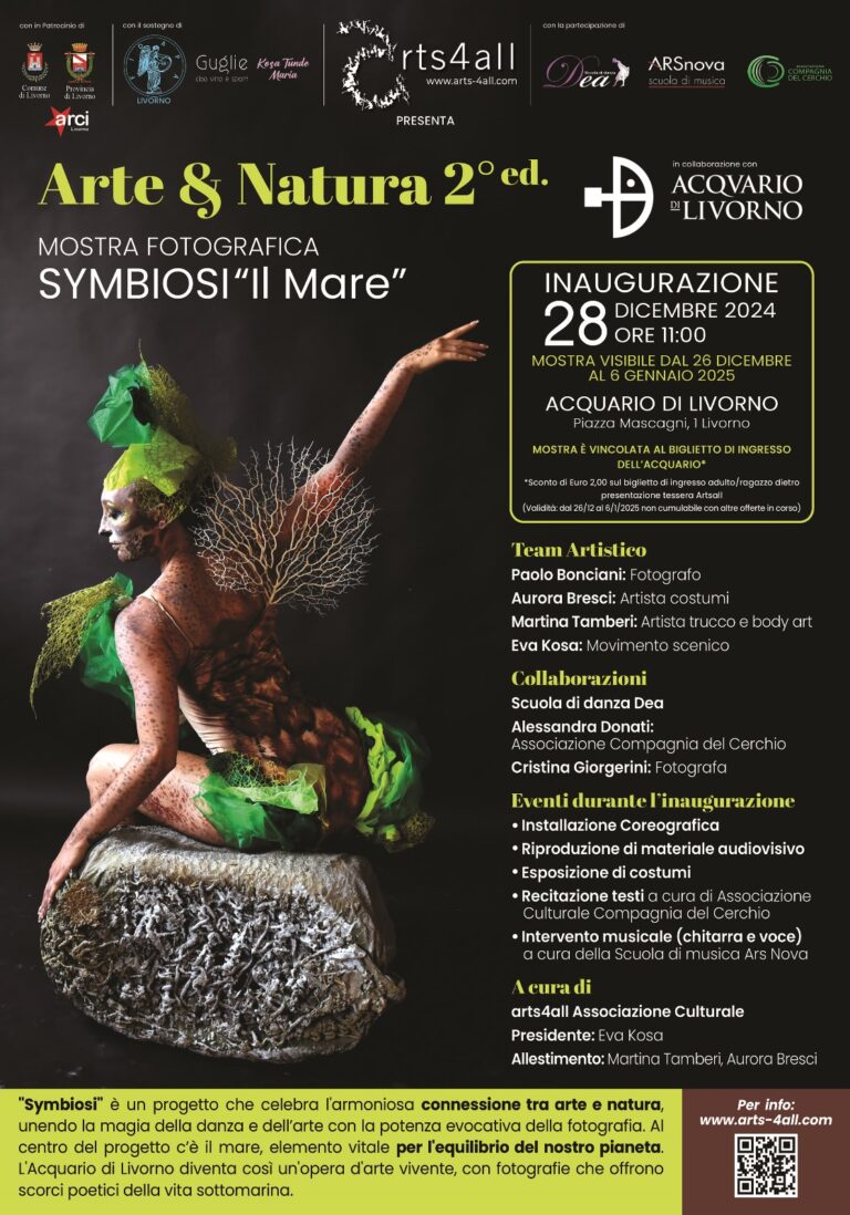 eSarà inaugurata Sabato 28 Dicembre alle ore 11 la mostra fotografica Symbiosi “Il Mare” – del progetto “Arte & Natura 2° edizione, a cura di arts4all Associazione Culturale, in collaborazione con l’Acquario di Livorno – che la ospiterà da 26 dicembre fino al 6 Gennaio 2025.