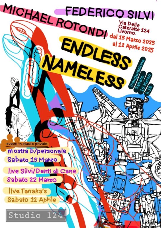 Il progetto Tanaka’s, ideato da Michael Rotondi e Valerio Fantozzi, nasce dall’intenzione di fondere architetture elettroniche con improvvisazioni ritmiche, chitarre post-punk, melodie romantiche e bassi distorti. I testi trattano temi come la biodiversità, gli effetti del riscaldamento globale, l’educazione disfunzionale e le relazioni sempre più complesse nelle sfere amicali e sentimentali. Il cantato, in italiano, si ispira foneticamente a band come CCCP, Offlaga Disco Pax e Sangue Misto, con un’inclinazione dalle controvoci popolari. Durante i live, il concerto si trasforma in una performance visiva, dove la band costruisce una colonna sonora che si integra con proiezioni multimediali, dando vita a un’esperienza sensoriale totale. Il piano di lavoro dei Tanaka’s prevede diverse collaborazioni e performance dal vivo che si adattano al contesto, con la possibilità di ampliare la formazione per futuri concerti. Il gruppo sta completando il loro disco, intitolato “Io Odio le Microplastiche Nevrotiche”, e continua a esplorare il multimediale creando versioni per videoclip dei loro brani, che vengono rilasciate in anteprima su Instagram sotto forma di “prototipi web” esclusivi per i social. Il live dei Tanaka’s farà parte della mostra Endless Nameless, curata da Michael Rotondi e Federico Silvi: un percorso visivo che esplora il rapporto tra lavoro manuale e viaggio urbano. La mostra è dedicata al mito dei Nirvana, band statunitense che negli anni ’90 ha influenzato profondamente i due artisti, portandoli a concepire il loro progetto espositivo come una contaminazione tra installazione visiva e performance musicale. Inaugurata il 15 marzo, la mostra è visitabile su appuntamento ed è arrivata al terzo evento, dopo il live di Silvi e Denti di Cane, coronando la visione del curatore, Luca Misuri, di progettare percorsi visivi in stretta connessione con la musica contemporanea e la fusione di generi musicali in uno spazio gestito da artisti e musicisti.