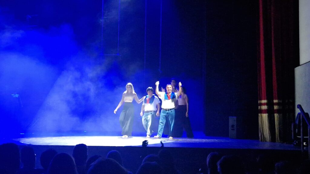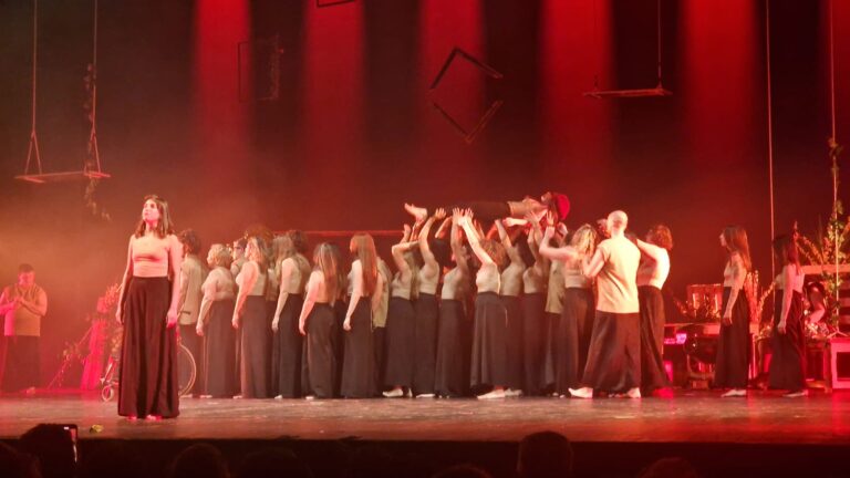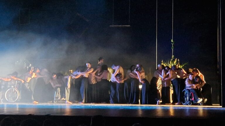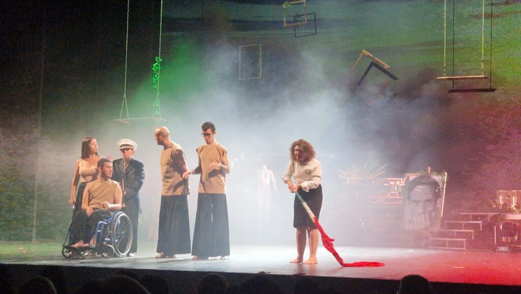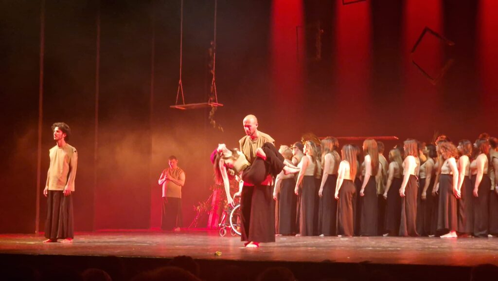 C’è la lettera alla mamma di una ragazza uccisa per femminicido che ti incolla alla sedia e ti toglie il fiato a singhiozzi, c’è Yuri che ti sfila un sorriso, c’è il ballo di gruppo che unisce, ci sono le immagini di una guerra che, come tutte le guerre, non dovrebbe mai essere combattuta. C’è l’ombra della morte, presente che incombe ma che viene esorcizzata con il rito laico comune del Teatro, sacra metamorfosi di resurrezione. C’è la coerenza da mandare a fanculo con veemenza e con orgoglio. C’è l’accettazione del diverso, del corpo femminile, della disabilità schiaffata sul muso senza preavviso, senza scuse. Senza rete.