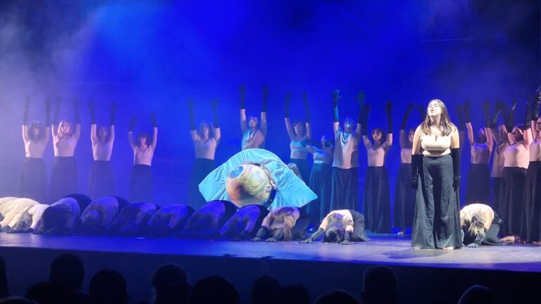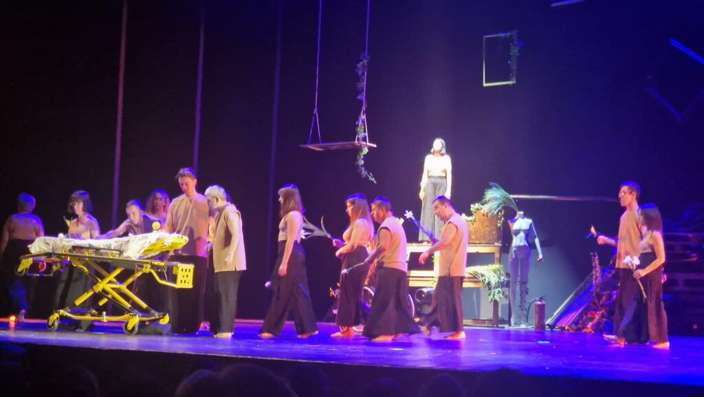 I Mayor ancora una volta ti portano sulla giostra di sensazioni che solo loro sanno farti provare. Si passa dal pianto vivo, vero, sentito e straziante alla risata fragorosa, sincera anche volgare ma mai sguaiata. C’è la musica a fare da collant a tutto, le decine di attori che si muovono sul palco disgiunti e uniti, che fluiscono in platea, rendendo un tutt’uno lo spettacolo, fondendo lo spettatore con la performance artistica. Un flusso continuo, uno stream of consciousness costante e incessante. Un sogno lucido. E lo spettatore diventa come sonnambulo davanti a questi attori che si scaraventano sul palco. Senza rete. Come nella vita. Come in uno sguardo all’incrocio che mai più tornerà. Come quelle palpebre che non si chiudono di notte.