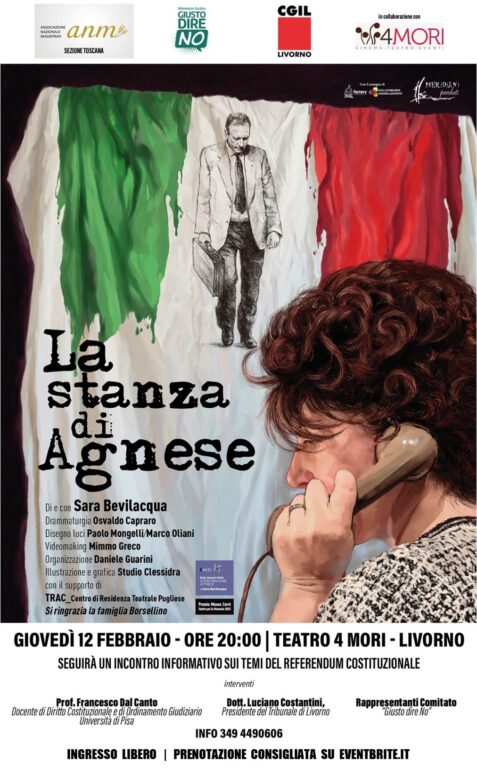 Lo spettacolo, nato nel trentennale delle stragi di Capaci e via D’Amelio, racconta la vita e la storia di Paolo Borsellino attraverso gli occhi di sua moglie Agnese. Vincitore di numerosi premi tra cui il prestigioso Eolo Award 2024 per la miglior attrice ed il Premio Museo Cervi – Teatro Per la Memoria 2025, La Stanza di Agnese restituisce la figura del magistrato palermitano da una prospettiva umana e familiare.