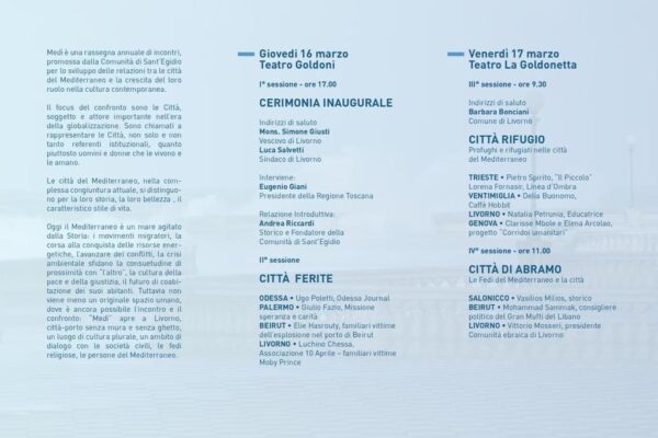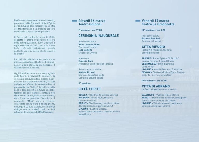 Con un pensiero speciale all’Ucraina, a un anno dall’inizio della guerra, torna il 16 e 17 marzo al Teatro Goldoni, “Medì, le Città hanno un’anima”, incontro internazionale tra le città del Mediterraneo, che intende promuovere le relazioni tra le società civili e le città e la “mediterraneita’” quale cultura per vivere nella complessità attuale, significativa alternativa al bellicismo. L’evento è promosso dalla Comunità di Sant’Egidio, insieme al Comune di Livorno, con il patrocinio della Regione Toscana, con la collaborazione della Diocesi e di Istoreco. Medì, quest’anno darà appunto voce all’Ucraina, anche se ospiterà numerose Città e Fedi del Mediterraneo, unite a Livorno da antichi legami, e sarà suddiviso in 4 sessioni: il primo giorno è prevista dalle ore 17.00 una cerimonia inaugurale alla quale parteciperà anche il fondatore della Sant’Egidio Andrea Riccardi; a seguire la seconda sessione sulle “Città ferite”. La seconda giornata sarà suddivisa nelle sessioni “Città rifugio: profughi e rifugiati nelle città del mediterraneo”, alle 9.30 e “Città di Abramo: le Fedi del mediterraneo e la città” alle ore 11.00.