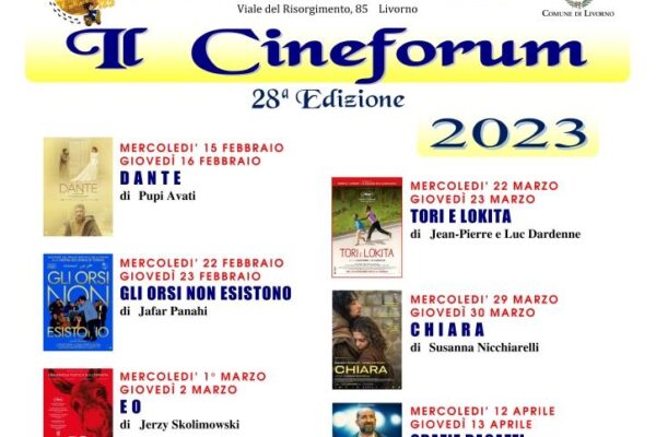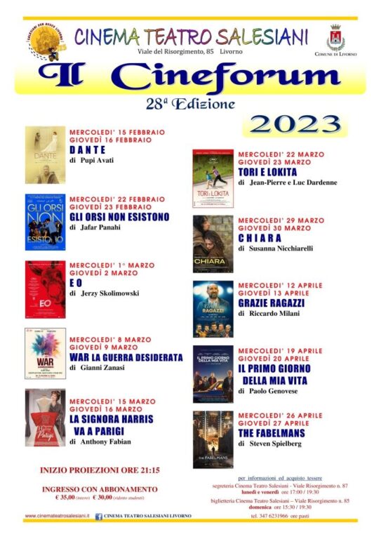 A partire da mercoledì 15 febbraio con il film “DANTE” di Pupi Avati riprende il Cineforum al Cinema Salesiani di Livorno giunta alla sua 28° edizione. Da quest’anno gli appuntamenti avranno luogo il mercoledì e il giovedì alle ore 21:15 per consentire la partecipazione ad una platea più ampia. I film scelti appartengono ad un repertorio nazionale e internazionale per favorire il confronto stilistico e contenutistico delle varie regie, affidate ad artisti di larga fama. Particolarmente significativa è la presenza nella programmazione di pellicole originali per la trattazione di tematiche a sfondo sociale che mettono a confronto proposte di differenziata provenienza culturale. In particolare il capolavoro dei belgi,  Jean-Pierre e Luc Dardenne con il film “Tori e Lokita” che affronta il delicato tema dell’immigrazione dei minori. La commedia italiana di Riccardo Milani è rappresentata nel film “Grazie Ragazzi” che ci offre stimoli e riflessioni relative ai luoghi di detenzione e alla possibilità di un cambiamento di vita per i carcerati. Anche l’esperienza dell’asino “EO”, curata dalla regia del polacco Jerzy Skolimowski ,diviene lo sguardo che appare  a lui vicino e scompone i consueti modelli sociali.