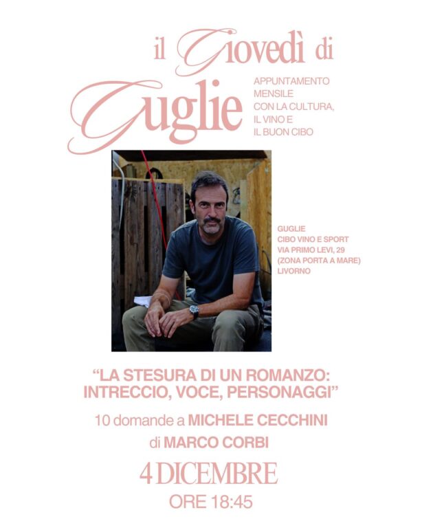 Il terzo incontro sarà dedicato al tema “La stesura di un romanzo: intreccio, voce, personaggi”. Per l’occasione Corbi rivolgerà dieci domande a Michele Cecchini, autore livornese di numerosi romanzi e testi teatrali. Il suo ultimo libro, Un morso all’improvviso (Bollati Boringhieri, 2023), ha ricevuto ottimi consensi di pubblico e critica.