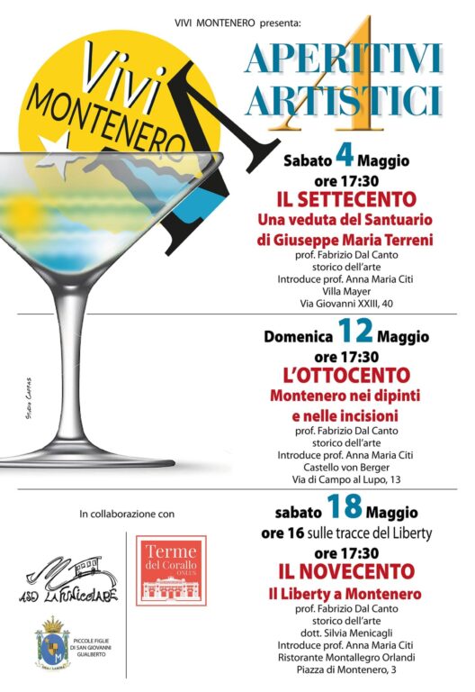 Come ormai è diventata tradizione, si rinnovano anche quest’anno gli “aperitivi artistici” a Montenero, curati dall’Associazione ViviMontenero. Sono aperitivi itineranti che permettono di scoprire il territorio e le sue bellezze artistiche, che in questa occasione saranno tre residenze storiche di epoca diversa. Infatti i tre incontri di maggio, di cui i primi due in collaborazione con ASD La Funicolare, saranno impostati in ordine cronologico: nel primo, sabato 4 alle ore 17.30, a villa Mayer, risalente al Settecento, il prof. F. Dal Canto illustrerà l’opera di Giovanni Maria Terreni, mentre nel secondo incontro, domenica 12 alle 17.30, nella cornice della villa ottocentesca nota come Castello von Berger, il professore commenterà una serie di vedute di Montenero dell’Ottocento. In entrambi i casi seguirà un brindisi offerto dalle suore “Piccole Figlie di San Giovanni Gualberto” che attualmente gestiscono le due strutture. Il terzo incontro, sul Novecento, in collaborazione con l’Associazione Terme del Corallo, sarà più articolato. L’appuntamento sarà sabato 18 alle ore 16 in Piazza delle Carrozze per partire con la funicolare per la Piazza del Santuario. Da qui inizierà una passeggiata alla ricerca delle testimonianze più significative del liberty a Montenero che si concluderà alle 17.30 al Ristorante Montallegro, dove il prof. Dal Canto fornirà un quadro generale del liberty in Italia e la dott.ssa Silvia Menicagli illustrerà la presenza del liberty a Montenero. Seguirà un aperitivo che terminerà in tempo per l’ultima corsa della funicolare alle ore 20. Per questo ultimo incontro sarà necessaria la prenotazione al numero 338 3282797.