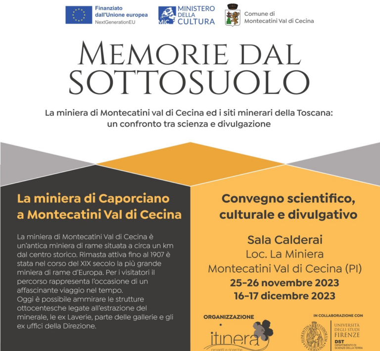 Convegno dedicato alla Miniera di Montecatini Val di Cecina organizzato da Coop. Itinera – Comune di Montecatini Val di Cecina in collaborazione con Università degli Studi di Firenze Dip. Scienze della Terra. Il convegno è in programma il 16 dicembre con orario 10 – 17 nella Sala Calderai – Loc. Montecatini Val di Cecina (PI). Per informazioni: c/o Itinera 0586 894563.