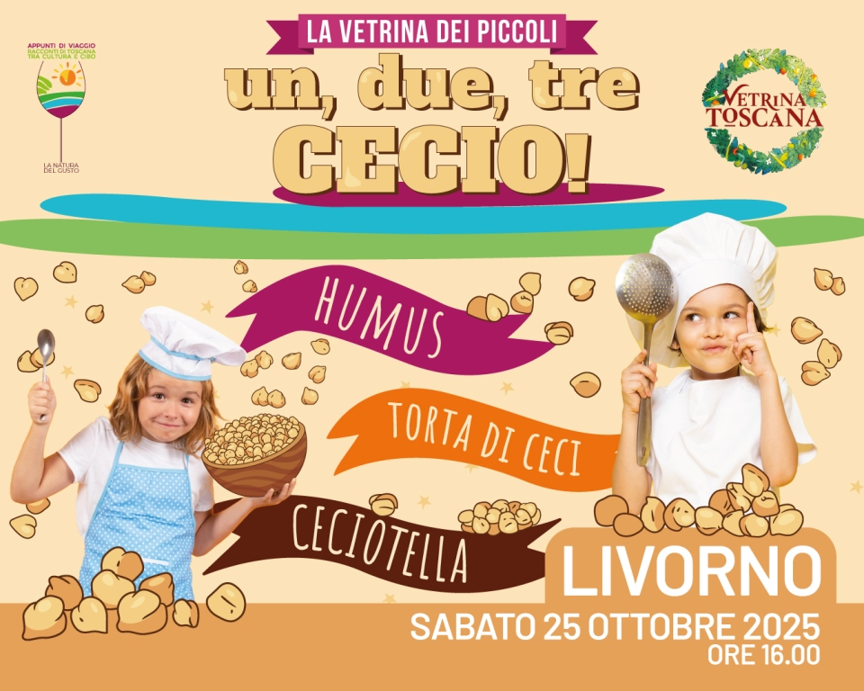 L’evento “Un, due, tre cecio”, in programma nei locali della Sede Slow Food in via Calafati 7 (Porto Mediceo), propone tre ricette a base di uno dei legumi più versatili e nutrienti che madre natura ci abbia donato: il cecio. Evento “Vetrina dei Piccoli” in collaborazione con Coop. Itinera, Slow Food Condotta di Livorno e La Bottega di Campagna Amica. Organizzato da Confesercenti Provinciale di Livorno per Vetrina Toscana con il contributo di Camera di Commercio del Tirreno e della Maremma e della Regione Toscana. Dal classico e interculturale hummus, alla tradizionale torta di ceci livornese, fino alla più curiosa e golosa ceciotella – la versione sana e artigianale della più nota crema spalmabile – i piccoli partecipanti potranno scoprire quanta ricchezza culinaria si nasconde dietro un alimento troppo spesso considerato “povero”. Tra impasti, profumi e assaggi, il laboratorio aiuterà i bambini a conoscere il valore della cucina genuina, dell’origine degli ingredienti e della cultura gastronomica locale, in modo divertente e pratico.