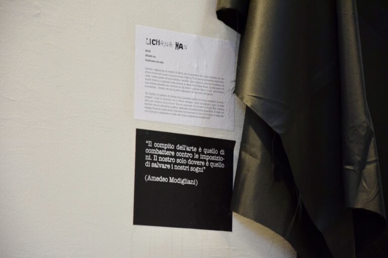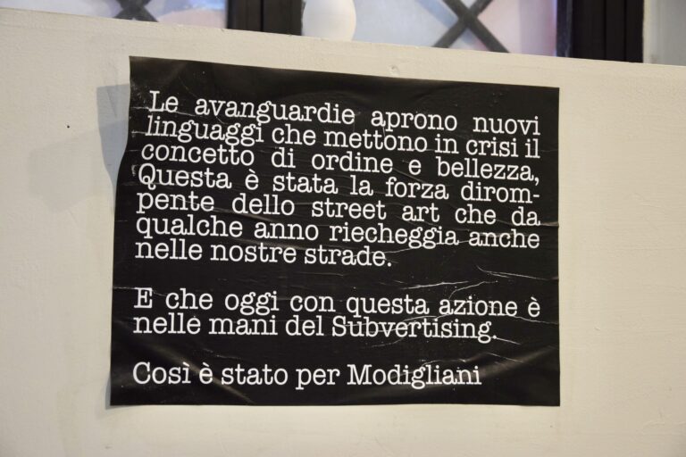 Una volontà quindi, quella del progetto, di riappropriarsi del Modì autentico, quello alcolizzato, drogato, amante dell’Espressionismo e della filosofia tardo romantica. “Quella di Illustre Feccia – spiega la curatrice Tommasini – è un’arte che viene dalla strada con lo scopo di sovvertire i messaggi giocando sul paradosso surrealista per offrire una visione forte, a volte persino ripugnante, ma che fa riflettere. L’autore sperimenta varie tecniche, tra cui alcune notissime con l’olio o l’acrilico, quindi non è detto che chi lavora in strada non possa poi esporre in un’altra forma”. Nel corso della presentazione un misterioso personaggio con il volto coperto da una maschera (l’artista? chi lo sa) è comparso pronunciando le seguenti parole: “Io sono Modigliani e sono tornato nella mia città perché troppe volte ho visto usare la mia immagini per vendere di tutto. Nello specifico, sono tornato per una mostra che parla di me in un altro modo in cui io sono diventato e cioè Amazon. Vi ringrazio e godetevela”. Insomma, un pomeriggio davvero goliardico per presentare un’esposizione visitabile gratuitamente fino al 18 marzo. Ma una cosa, viene da chiedersela: lo scherzo iniziale era davvero necessario?