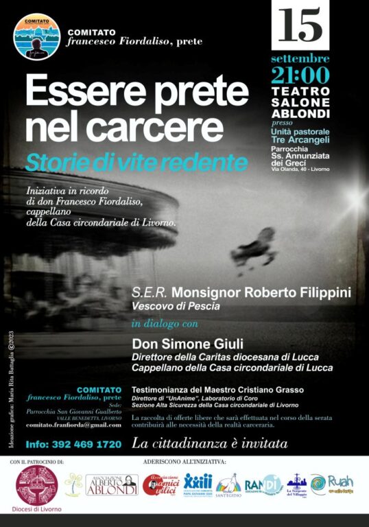 Venerdì 15 settembre nel Salone Ablondi della Parrocchia Ss. Annunziata dei Greci di Livorno è in programma l’iniziativa promossa dal Comitato “francesco Fiordaliso, prete” di Livorno dal titolo “Essere prete nel carcere, storie di vite redente“. L’evento è in ricordo di don Francesco Fiordaliso, cappellano della Casa circondariale “Le Sughere”, che ci ha lasciati poco più di un anno fa. A confrontarsi sul tema, introdotti da don Raffaello Schiavone, parroco della parrocchia ospitante, saranno monsignor Roberto Filippini, vescovo di Pescia e già cappellano della Casa circondariale di Pisa, e don Simone Giuli, direttore della Caritas diocesana di Lucca e cappellano della Casa circondariale della stessa città. Il Maestro Cristiano Grasso, direttore del Laboratorio di coro “UnAnime” nella sezione Alta sicurezza della Casa circondariale di Livorno, contribuirà con una testimonianza. L’ingresso è libero, senza prenotazione.
