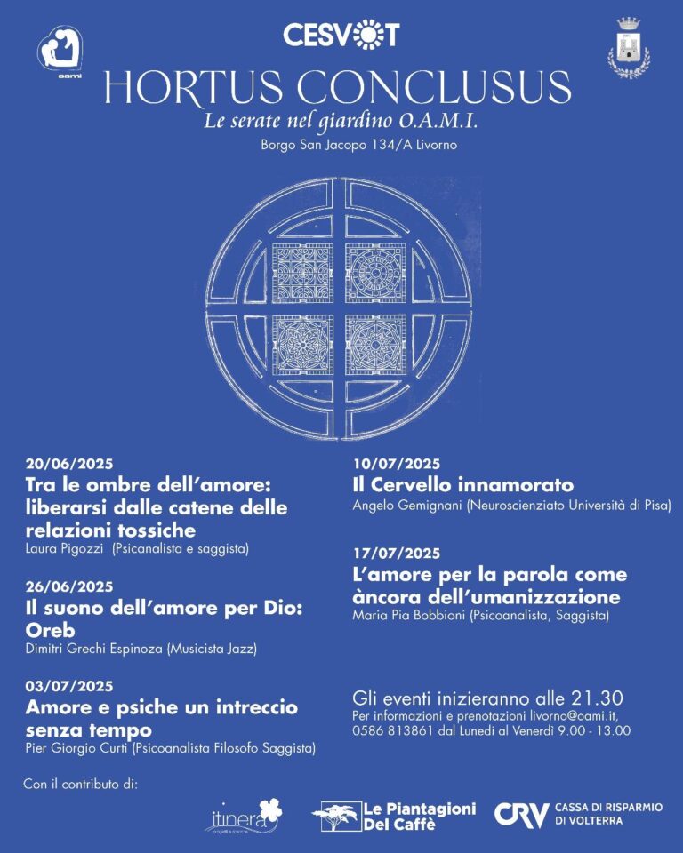 Nel cuore di Livorno, in uno degli angoli storici della città, il giardino dell’O.A.M.I. si trasforma per il secondo anno consecutivo in un luogo raccolto di incontro e di pensiero. Hortus Conclusus – Le serate nel giardino O.A.M.I., giunge infatti alla seconda edizione dopo il grande successo della prima, e si conferma molto più di una “semplice” rassegna culturale: piuttosto un invito a rallentare, ad ascoltare, a esplorare il mistero delle emozioni umane attraverso linguaggi diversi che si intrecciano e diventano comunicanti. «Hortus Conclusus è un luogo di resistenza e profondità in un tempo in cui il pensiero è spesso sacrificato alla velocità e all’efficienza – spiega il direttore scientifico della rassegna e dello stesso O.A.M.I., Pier Giorgio Curti – è un giardino in cui coltivare l’umano, anche simbolicamente. Livorno, con la sua storia e la sua sensibilità, è il luogo ideale per un progetto come questo: aperto, plurale, autentico».