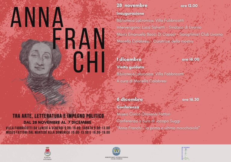 Giovedì 28 novembre alle 12 alla Biblioteca Labronica F.D. Guerrazzi di Villa Fabbricotti sarà inaugurata alla presenza del sindaco Luca Salvetti la mostra Anna Franchi, tra arte, letteratura e impegno politico. L’allestimento, organizzato in occasione dei 70 anni dalla sua scomparsa e promosso da Soroptimist International Club Livorno, in compartecipazione con il Comune di Livorno e con il patrocinio dell’Archivio di Stato di Livorno, vuole celebrare questa incredibile ed eclettica personalità, impegnata su più fronti: la letteratura, la musica, il giornalismo, le rivendicazioni femministe e la critica d’arte. Le numerose pubblicazioni, carte d’archivio e fotografie conservate nel Fondo Anna Franchi della Sezione di Storia Locale saranno esposte nel ballatoio al primo piano di Villa Fabbricotti in un percorso che racconta gli aspetti più significativi dell’intensa attività di scrittrice e giornalista, esaminando la sua prolifica attività nel mondo dell’arte e i solidi legami con i Macchiaioli, tematiche parallelamente approfondite nelle sale di Villa Mimbelli.