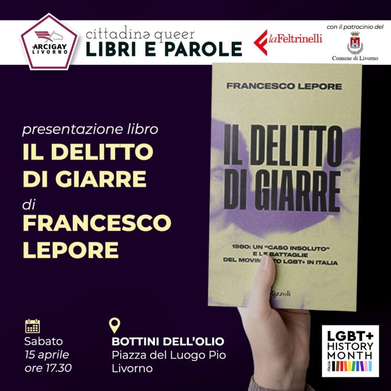 Il quarto appuntamento di questa iniziativa si terrà presso la Biblioteca Bottini dell’Olio a Livorno, dalle ore 17:30, e vedrà come protagonista l’autore e giornalista Francesco Lepore con il suo libro “Il delitto di Giarre. 1980: un «caso insoluto» e le battaglie del movimento LGBT+ in Italia”. Attraverso l’attenta ricostruzione del delitto che vide coinvolti Giorgio Agatino Giammona e del quindicenne Antonio Galatola, Francesco Lepore racconta quattro decenni di battaglie e rivendicazioni del movimento LGBT+ italiano.