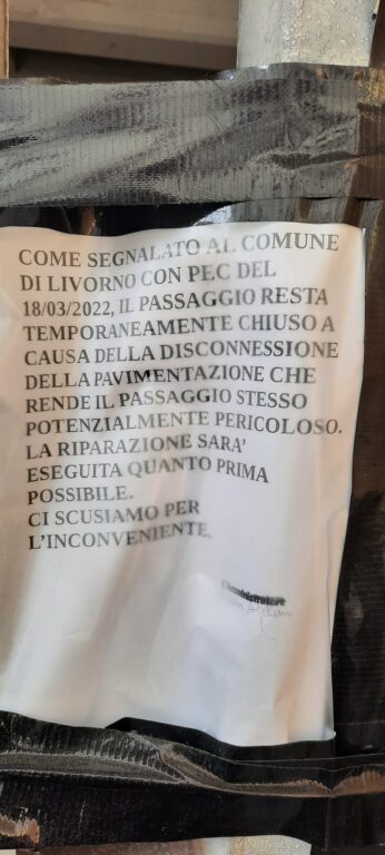 La presunta riparazione della pavimentazione (così come segnalato sul cartello posto sui cancelli di accesso del passaggio pedonale) si sta prolungando ormai per troppo tempo, creando così disagi per i cittadini e notevoli difficoltà economiche per le attività che insistono su via Roma e via Cecconi.