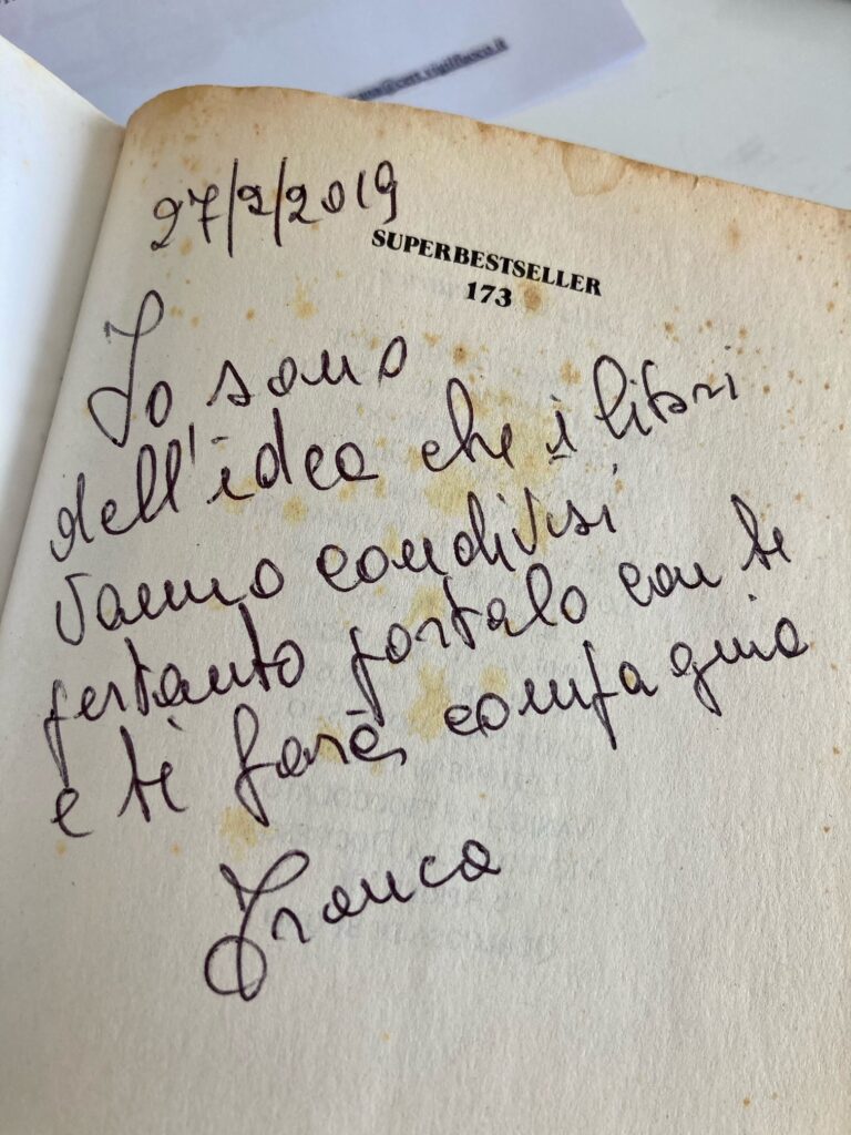 Dopo la pubblicazione di questa lettera Quel libro “di tutti” sul lungomare è proprio una cosa bella in tanti hanno scritto alla redazione chiedendo il nome del libro. E così abbiamo chiesto di nuovo ad Alessandra che ha risposto così: “Sono contenta e sorpresa che abbia avuto questo riscontro e soprattutto che le persone siano così sensibili e interessate. Il titolo del libro è “Sveva Casati Modignani Il Barone“. Nella prima email che vi ho inviato ho omesso di inserire la foto con la dedica della prima persona (Franca) che ha lasciato il libro sul muretto, ve la inoltro adesso. Il mio desiderio sarebbe quello di poter conoscere le due signore Franca e Marzia. Chissà se leggeranno. E’ anche per questo motivo che ho deciso di inviarvi la notizia”.