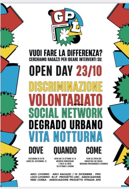 Gpl – Giovani protagonisti livornesi è un progetto in cui i giovani sono chiamati a creare, ideare e progettare interventi a carattere sociale sul territorio livornese con la facilitazione di diverse associazioni locali. Sabato 23 dalle 18 alle 20 piazza Garibaldi si riempirà di musica: inizieremo con una Heavy Rotation per concludere con Eli G in casual piano, direttamente dalla fucina creativa de La Riuso. In loco troverete anche un punto informazioni dove i rappresentanti delle associazioni raccoglieranno le adesioni, illustreranno i progetti e il calendario degli incontri, in vista del prossimo open day. Ogni tavolo si incontrerà 2 volte al mese da ottobre 2021 a giugno 2022 e lavorerà per individuare le principali problematiche legate alla propria tematica (associazionismo, sicurezza e vita notturna, uso responsabile di internet, consiglio comunale degli studenti, riqualificazione urbana, discriminazione) e in seguito ideare e realizzare interventi concreti a riguardo. La grande novità del progetto GPL è che i giovani saranno veramente protagonisti in quanto ideatori del progetto stesso!!! Non perdete l’occasione di far parte di GPL il nuovo carburante per una città che riparte.